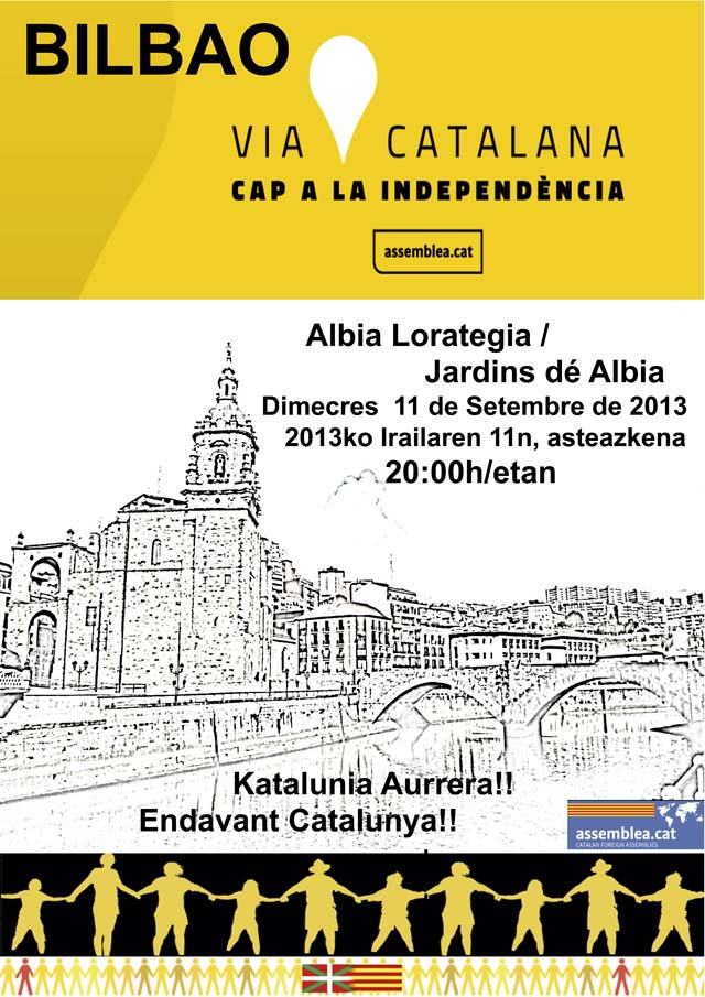 Katalunian Diada egun nazionalean ospatuko den Via Catalana ekimenarekin bat eginez,  giza-katea egingo dugu irailaren 11n, asteazkena, 20:00etan, Bilboko Albia lorategietan, Catalans a Bilbao taldeak eta Zenbat Gara elkarteak antolatuta. Katalunian, Assemblea Nacional Catalanak deitu duen giza-katea osatzen egongo den une berean Bilbotik gure babesa helaraziko diegu lagun katalanei, ondoren Cavarekin haien alde topa egiteko, Bilbon bizi diren hainbat katalanekin batera. Euskal eta kataluniar kantu-emanaldia eta bertsolariak ere ez dira faltako egitarauan eta aurreko minutuetan deialdirako propio egindako kamiseta horiak erosi ahal izango dira 5 euroan.