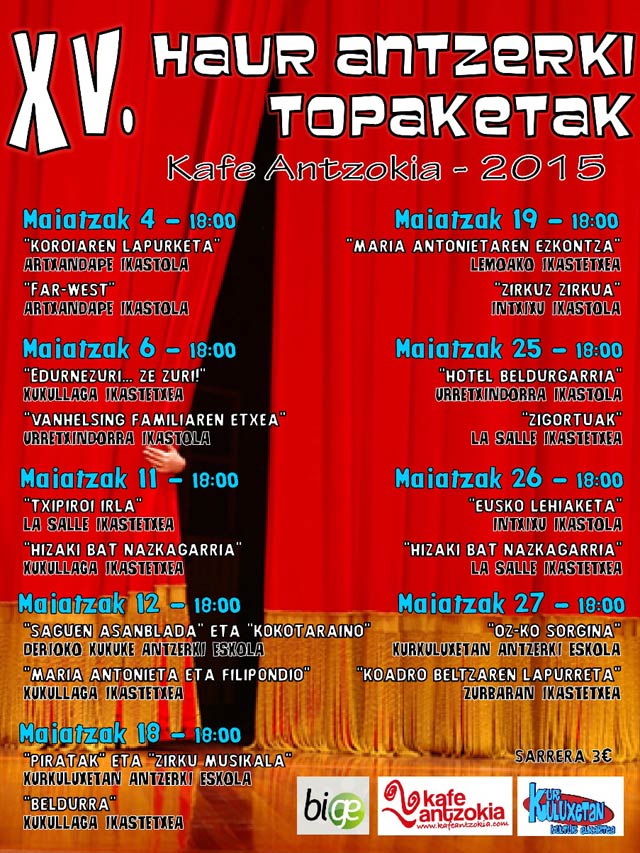 Gaur hasiko dira Bilboko Kafe Antzokian XV. Haur Antzerki topaketak.  Kurkuluxetan arte eszenikoen eskolak antolatuta, guztira bederatzi saio izango dira, maiatzaren 4, 6, 11, 12, 18, 19, 25, 26 eta 27an eta, guztira 18 antzezpen taularatuta, Bizkaiko hainbat ikastetxe eta ikastolak parte hartuko dute saio horietan. Guztira 550 haur antzezle igaroko dira topaketa hauetatik, Bizkaian egiten diren era honetako jardunaldirik handienak baitira hauek, eta antzezlan gehienak jatorrizkoak izango dira, topaketetarako propio sortuak.