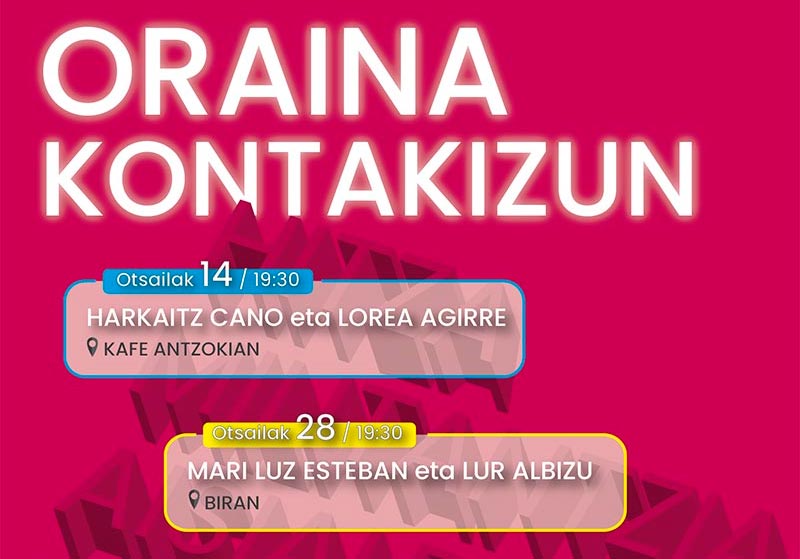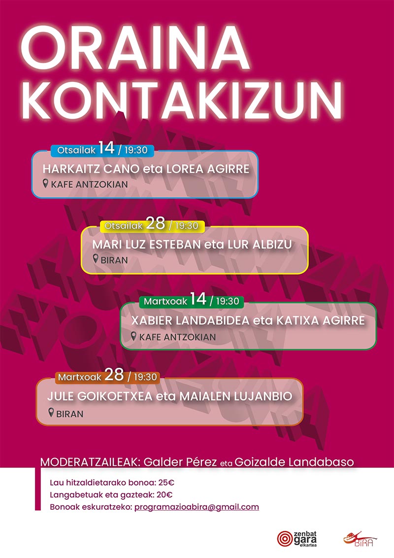 Otsailaren 14tik martxoaren 28ra, Bilboko Zenbat Gara elkarteak eta BIRA kulturguneak “Oraina kontakizun” jardunaldiak antolatu ditugu. Lorea Agirrek, Harkaitz Canok, Mari Luz Estebanek, Hedoi Etxartek, Txabi Landabideak, Katixa Agirrek, Jule Goikoetxeak eta Maialen Lujanbiok hausnartu, gogoeta egin eta eztabaidatuko dute gaur egun horrenbeste entzuten eta erabiltzen dugun errelatu edo kontakizun hitzari buruz: oraina geu kontatzen ari gara ala kontatzen ari zaizkigu? Nola sortzen da errelatua? Nork kontatu ahal du? Nork ezin du? Zelako kontakizuna dugu honen eta horren inguruan? Nola aldatu/aldatzen da? Nola eragiten digu? Zein errelatu dira gaur egun guretzat berebizikoagoak? Nola aurre egin kontakizun bati…?