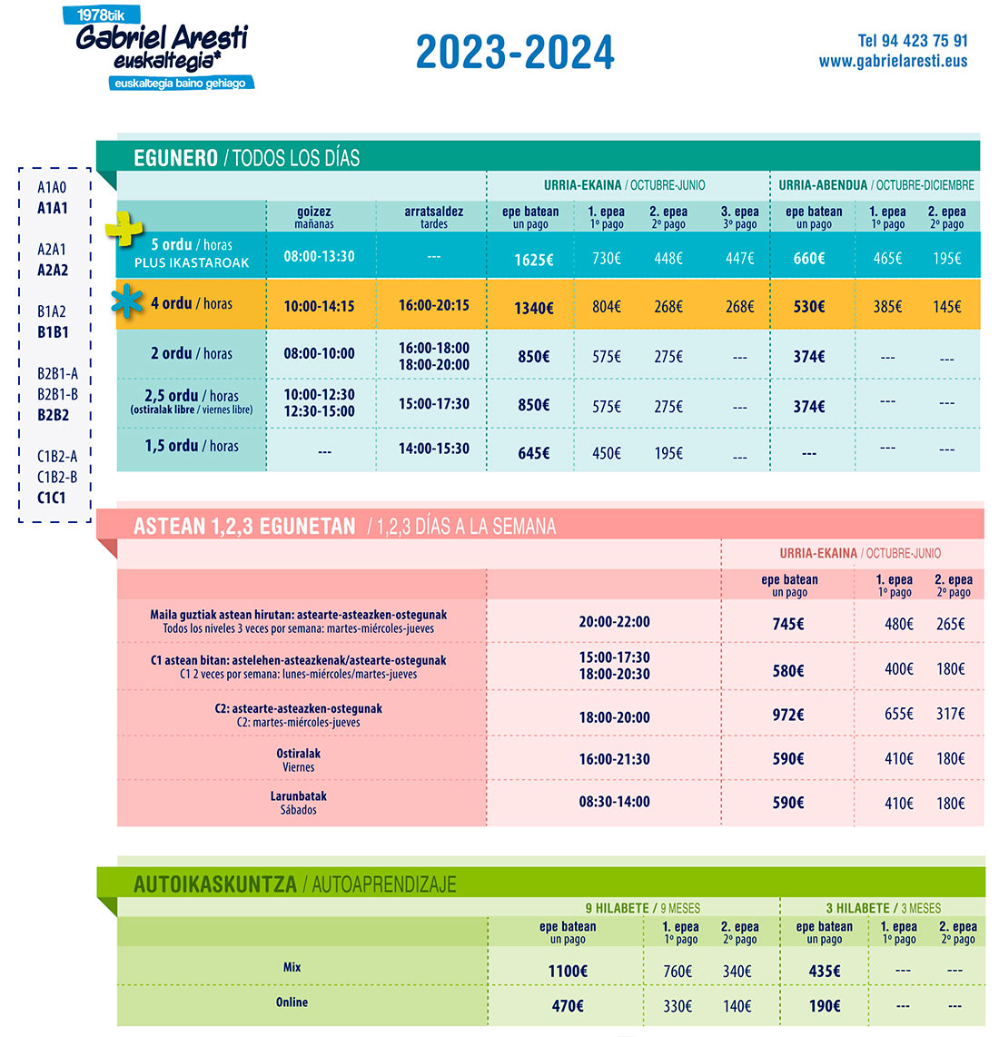 Ordutegi guztiak hemen duzun eskuorrian dituzu. Ikastaro bakoitzaren informazio zehatzagoa eta matrikula egiteko aukera gure webgunean aurkituko dituzu eta, zalantzarik izanez gero, gure 944237591 telefonora dei dezakezu, astelehenetik ostiralera, 9:00etatik 19:00etara. (Gabriel Aresti euskaltegiaren webgunetik ekarria).